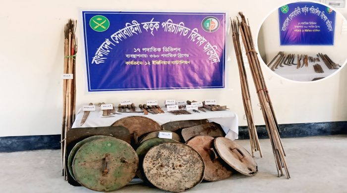 শিহাব মিয়া, মধ্যনগর (সুনামগঞ্জ) প্রতিনিধি: সুনামগঞ্জের মধ্যনগর উপজেলায় সেনাবাহিনীর বিশেষ অভিযানে চামরদানী ইউনিয়নের আমজোড়া গ্রাম থেকে বিপুল পরিমাণ দেশীয় অস্ত্র উদ্ধার করা হয়েছে। অভিযানের লক্ষ্য ছিল কুখ্যাত সন্ত্রাসী মোঃ উজ্জ্বল